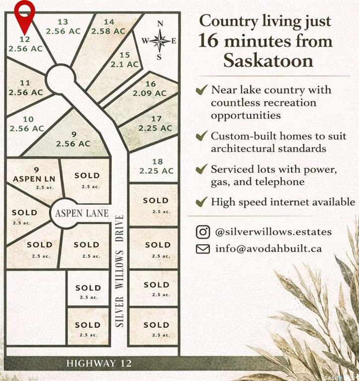 Looking for an acreage community with a close commute to the city? Welcome to Silver Willows Estates, a picturesque country living only 16 minutes from Saskatoon with architectural controls. Create your ideal lifestyle with plenty of space to build your dream home and have the acreage-style living room that you have always wanted. Imagine... Bonfires, open skies, and all things country life for you and your family to enjoy. Lake country is north on pavement, or city life is just a short drive away. K-12 sch...