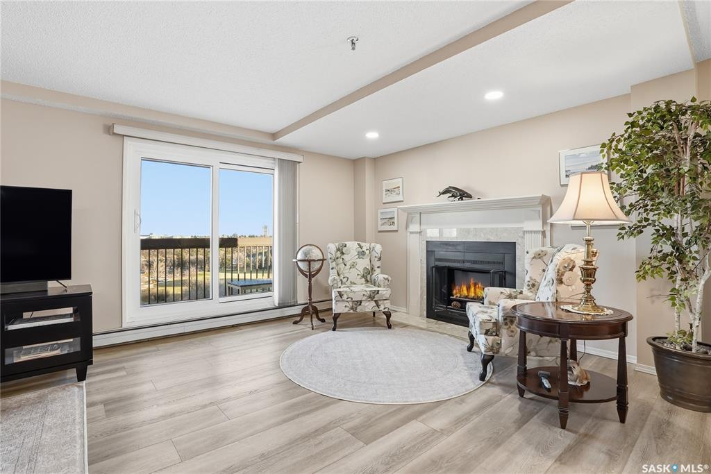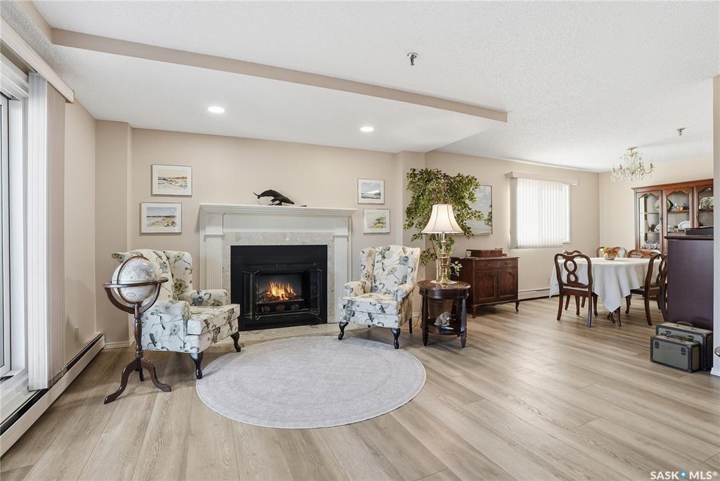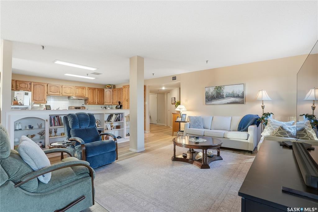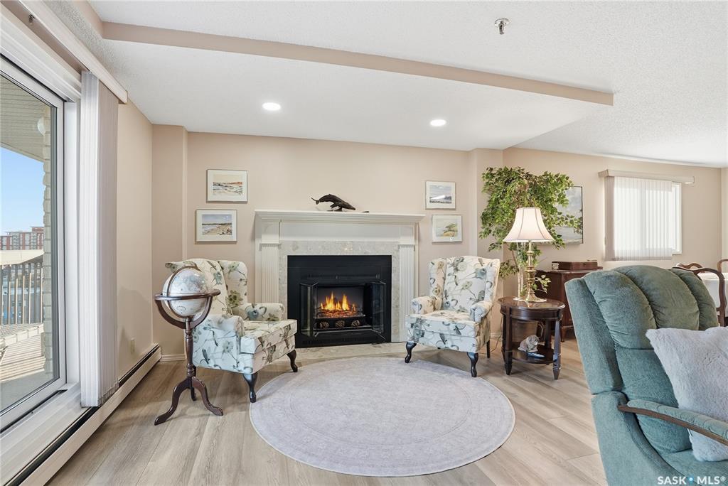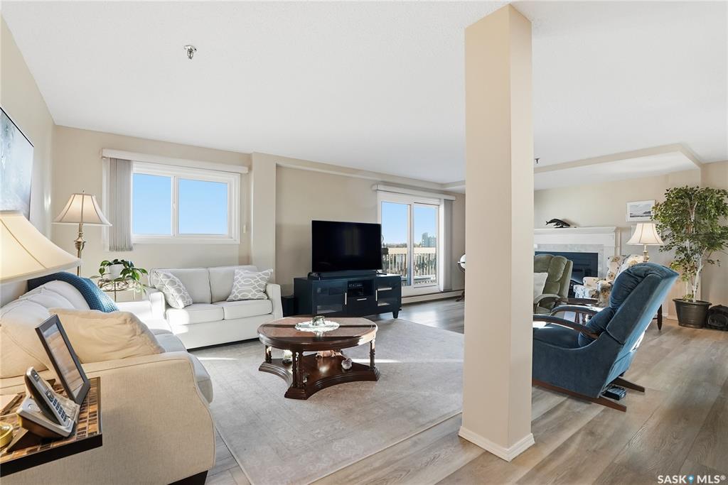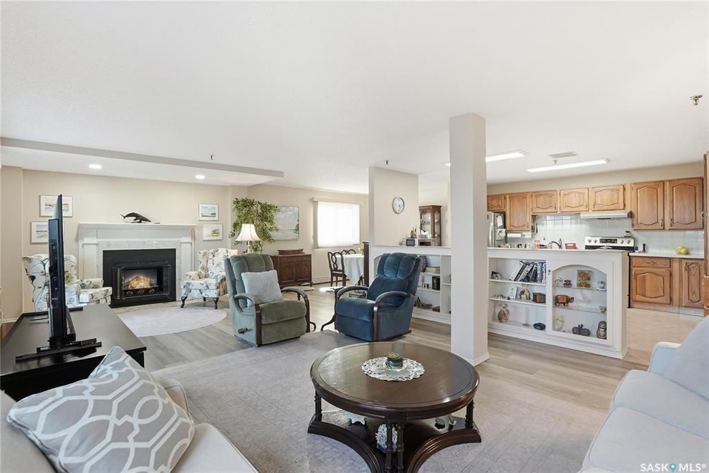 Welcome to unit 1003 – 510 5th Ave North located in the heart of Saskatoon’s desirable City Park neighborhood! This condo greets you with plenty of natural light flowing, a functional layout, and spectacular views overlooking Kinsmen Park! Step into your open concept living area, with laminate flooring, sliding glass door to your balcony with picturesque park views, gas fireplace against a tiled mantle, and recessed lighting. Your kitchen provides ample oak cabinetry, tiled backsplash, stainless steel appli...